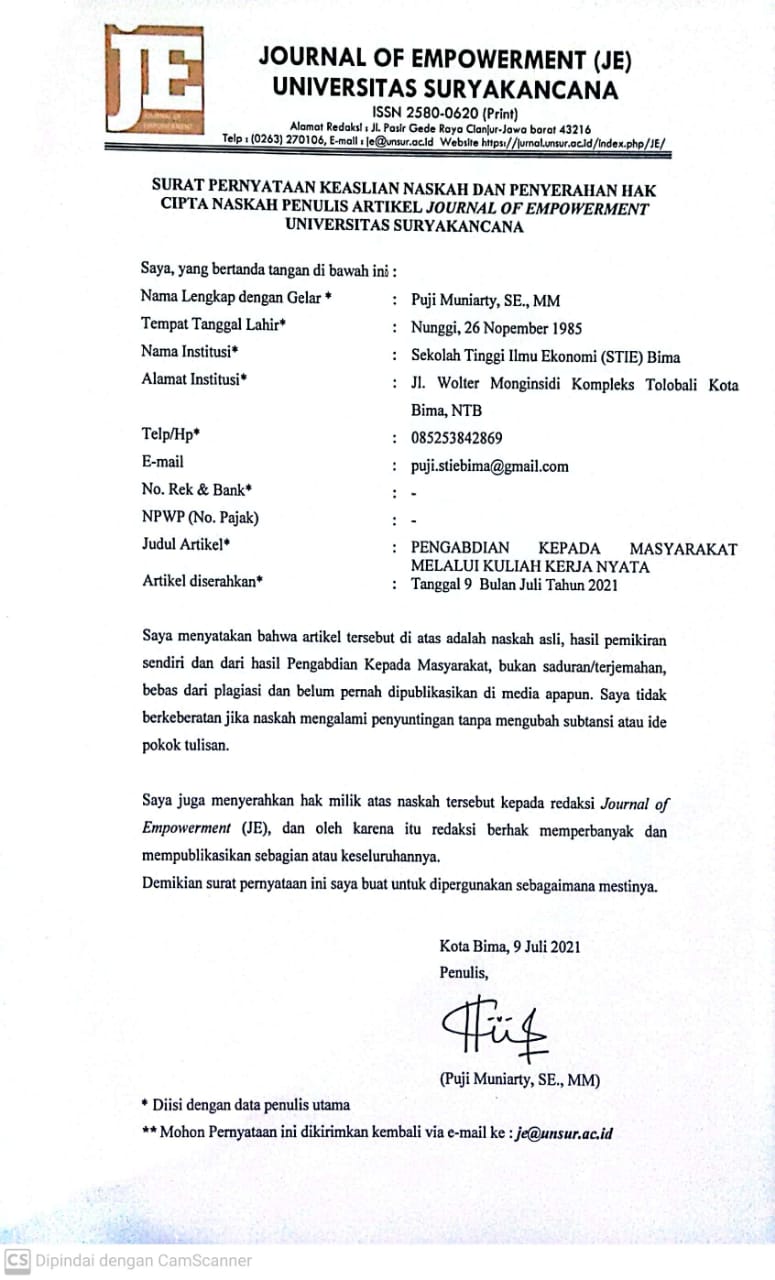 The Institute of Research and Community Service of Suryakancana University (LPPM UNSUR), as the publisher of JE (Journal of Empowerment), holds the copyright to all the published articles in this journal.